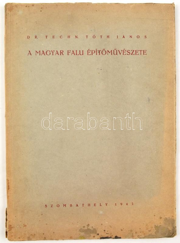 Dr. Tóth János: A magyar falu építőművészete. Szombathely, 1945, Martineum Rt. ny. Kiadói papírkötés, szakadt gerinccel, fekete-fehér képekkel gazdagon illusztrált, borító foltos.