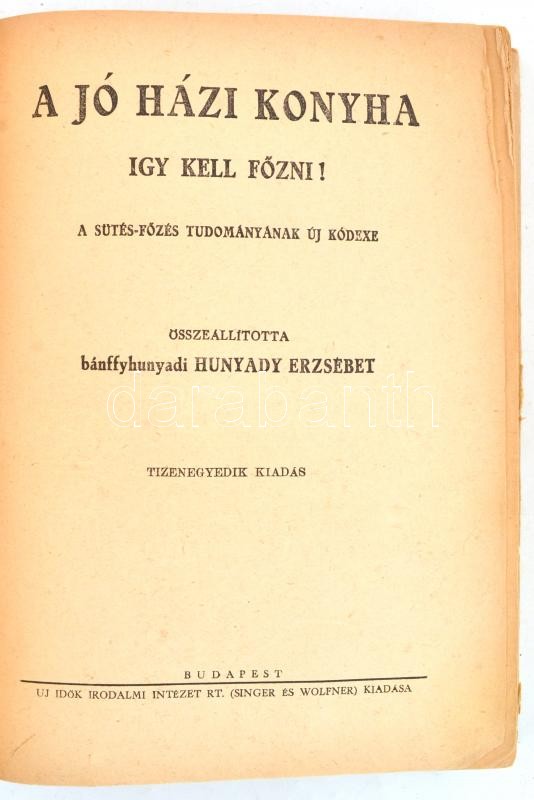A jó házikonyha. A sűtés-főzés tudományának új kódexe. Összeállította bánffyhunyadi Hunyady Erzsébet. Bp, é.n., Singer és Wolfner Rt. Tizenegyedik kiadás. Kiadói félvászon-kötés, enyhén kopottas borítóval.