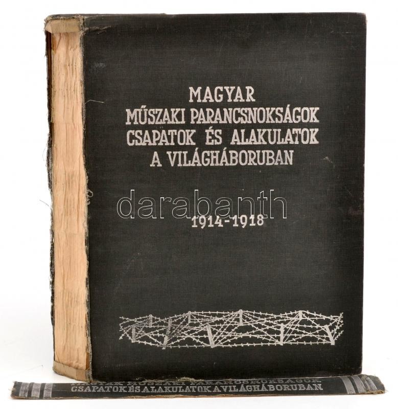 Magyar műszaki parancsnokságok, csapatok és alakulatok a világháborúban. Szerk.: Jacobi Ágost. Bp., 1938., Közlekedési Nyomda Kft., 8+759 p. Nagyon gazdag fekete-fehér képanyaggal illusztrált. Kiadói festett egészvászon-kötés, kopott borítóval, a gerinc levált,(de meg van), és a könyvtest egyben van, de belül jó állapotban.