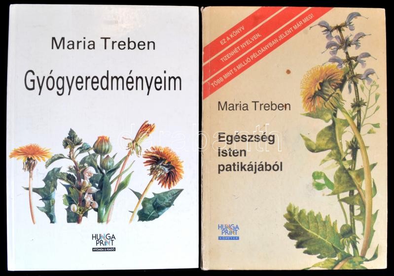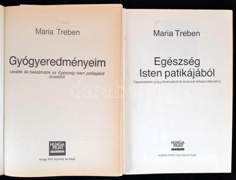 Treben, Maria: Gyógyeredményeim; Egészség Isten patikájából. 1990, Hunga Print Nyomda és Kiadó.Kiadói kartonált kötés, egyik jó, a másik sérült gerinccel, kopottas állapotban.