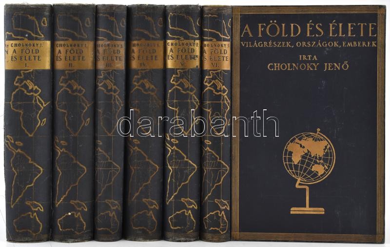 Cholnoky Jenő: A Föld és élete. I-VI. köt. Bp., [1936-1937], Franklin. Kiadói aranyozott egészvászon kötésben, kopottas állapotban, az I. és a II. kötet gerince sérült.