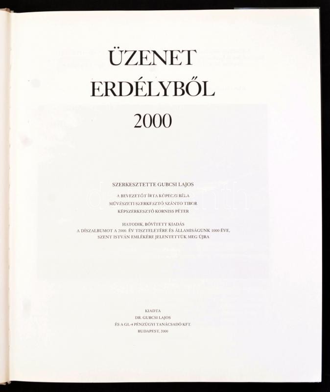 Leírás: Üzenet Erdélyből. Szerk: Gubcsi Lajos. Bp., 2000, GL-4 Pénzügyi Tanácsadó Kft.. Kiadói műbőr-kötés védőborítóban, tokban.