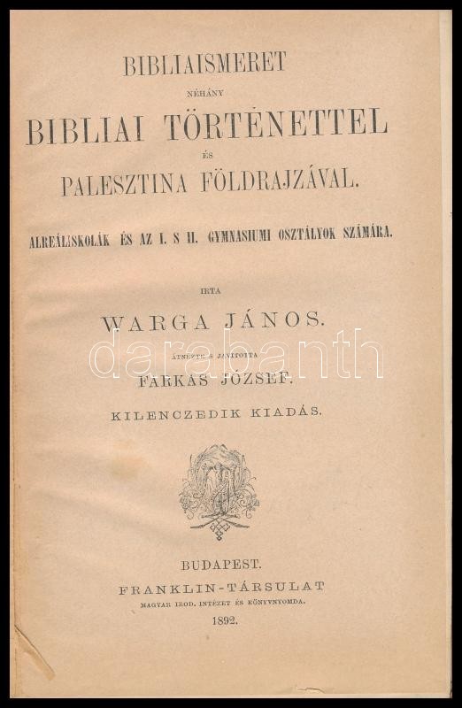 Warga János: Bibliaismeret, nehány bibliai történettel és Palaesztina földrajzával. 2 térképp. (135 l.) Budapest, 1874. Franklin. Félvászon kötés, laza fűzéssel, firkált lapokkal és térképpel.