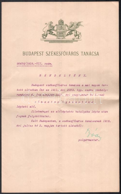 Leírás: 1918 Bódy Tivadar (1918-1920) budapest polgármesteránek aláírása igazgatói kinevezésen