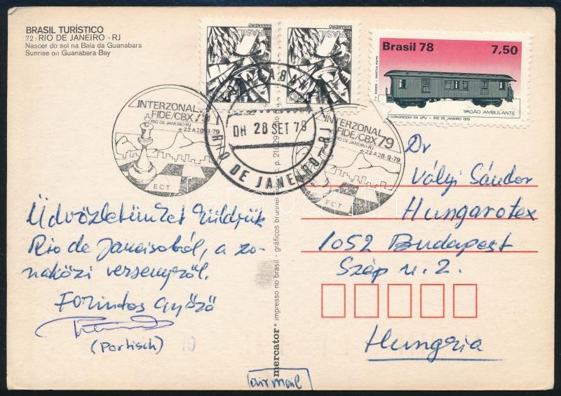 Leírás: 1979 Roi de Janeiro, zónaközi sakkverseny, üdvözlő képeslap Forintos Győző és Portisch Lajos aláírásával