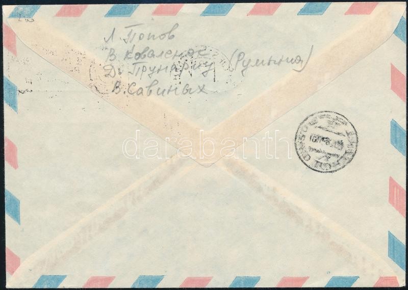 Leonyid Popov (1945- ), Vlagyimir Kovaljonok (1942- ), Viktor Szavinih (1940- ) szovjet és Dumitru Prunariu (1952- ) román űrhajósok aláírásai emlékborítékon / Signatures of Leonid Popov (1945- ), Vladimir Kovalyonok (1942- ), Viktor Savinykh (1940- ) Soviet and Dumitru Prunariu (1952- ) Romanian astronauts on envelope
