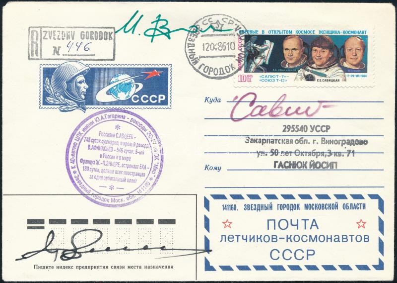 Szvetlana Szavickaja (1948-), Vlagyimir Dzsanyibekov (1942- ) és Igor Volk (1937- ) szovjet űrhajósok aláírásai emlékborítékon / Signatures of Svetlana Savitskaya (1948- ), Vladimir Dzhanibekov (1942- ) and Igor Volk (1937- ) Soviet astronauts on envelope