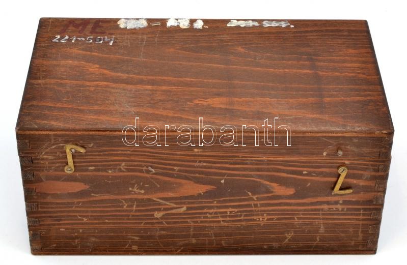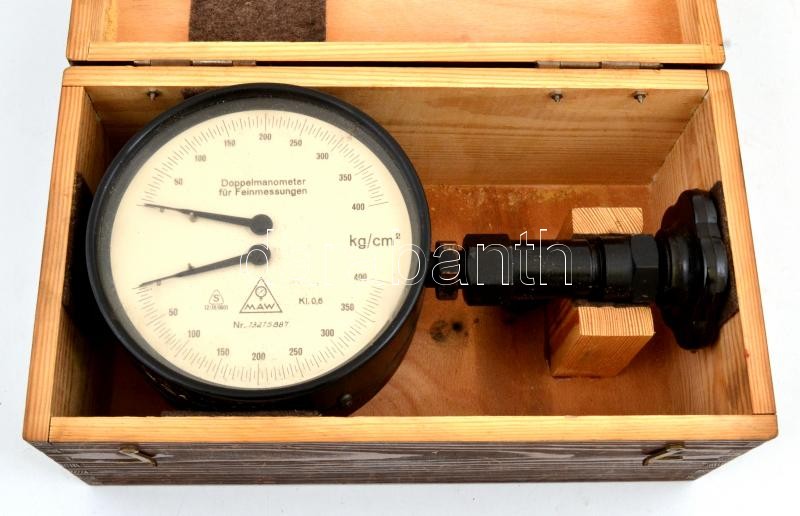 1954 dupla manométer finom mérésekhez (Doppelmanometer für Feinmessungen), NDK gyártmány (MAW, VEB Messgeräte- und Armaturenwerk Karl Marx), eredeti fa dobozban, gyári MEO papírjával német és orosz nyelven, enyhén kopott, nem kipróbált, d: 15 cm, h: 28 cm