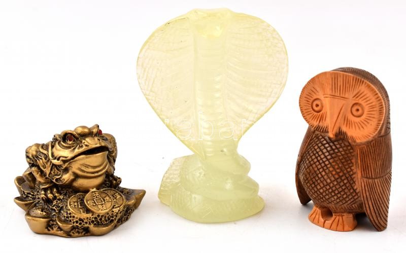 Leírás: 3 db állatfigura, műgyanta kígyó, fa bagoly, aranyozott béka piros kövekkel, jó állapotban, m: 10 cm, 8 cm, 5 cm