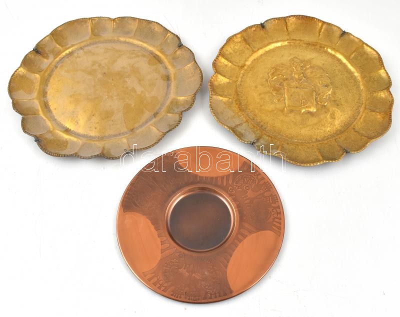 Leírás: 3 db iparművész és címeres réz tál d:19-25 cm