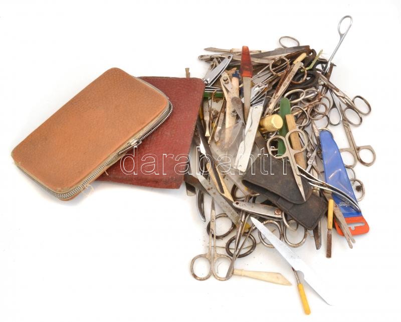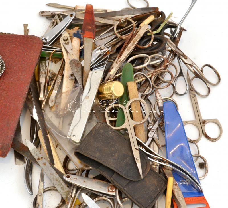 Leírás: 30 db olló, több db körömcsipesz, körömreszelő és hasonló eszközök, vegyes, részben rozsdás állapotban