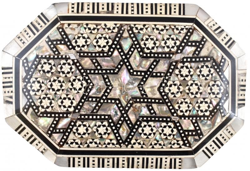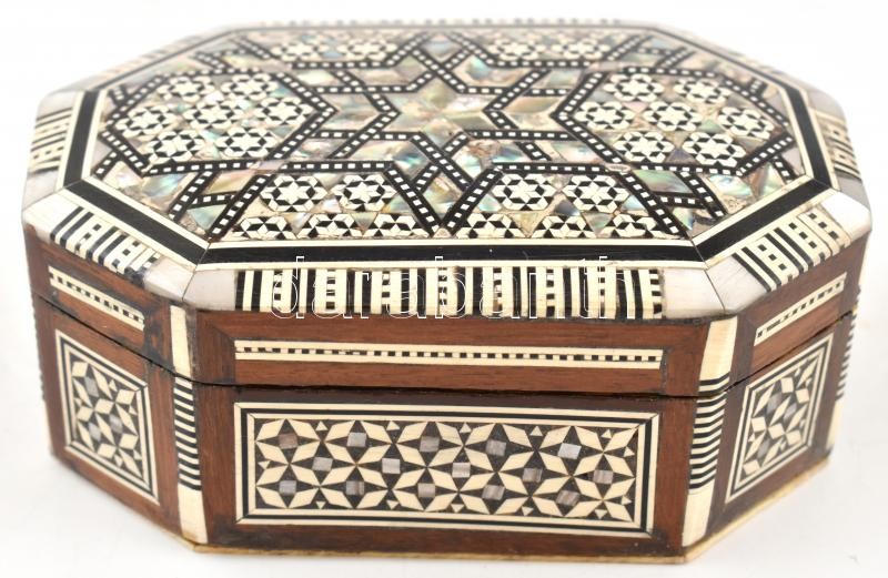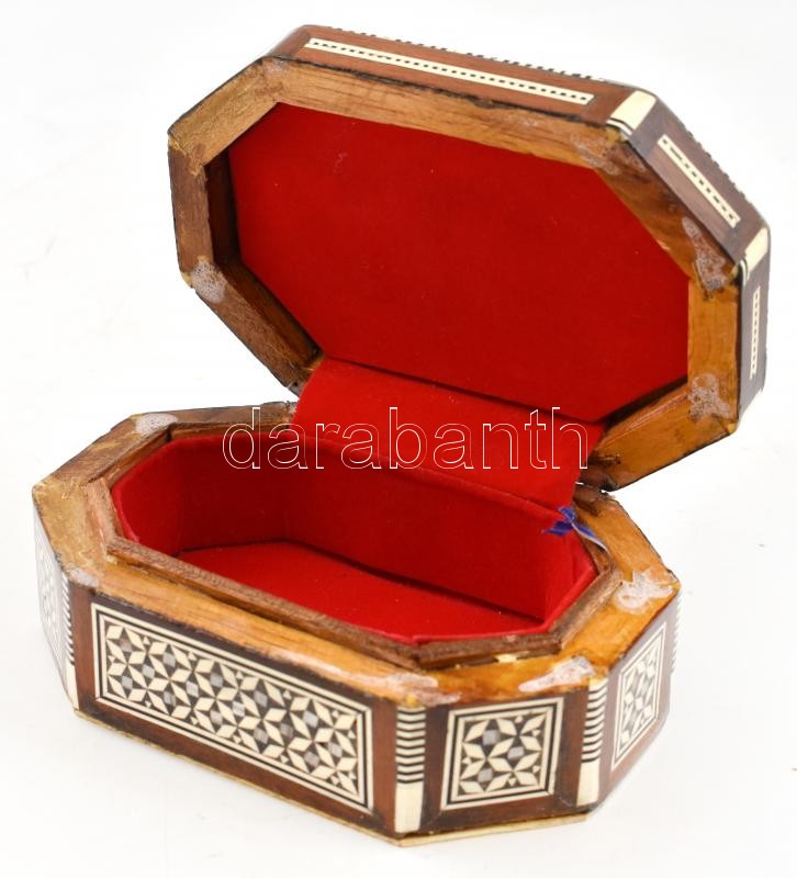 Leírás: Gyöngyházberakásos fa doboz, piros béléssel, kis hibákkal, 13,5×9×5 cm