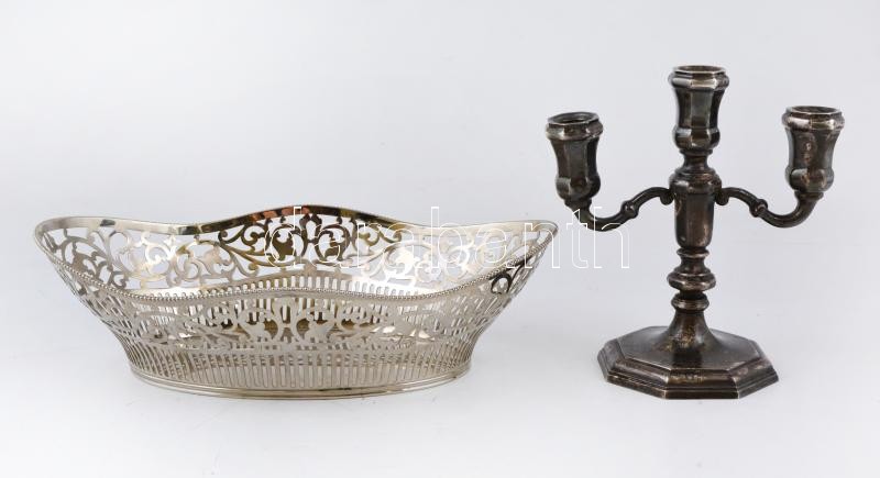 Leírás: Jelzett (PT) alpakka gyertyatartó 19 cm, áttört fém kosár 31x20 cm