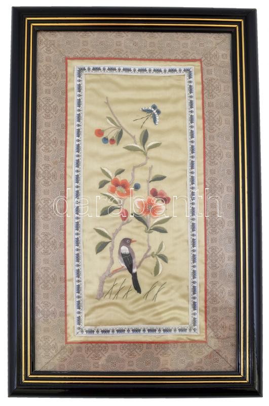 Leírás: Keleti-mintás selyem-hímzés, üvegezett fa keretben, 47x30 cm