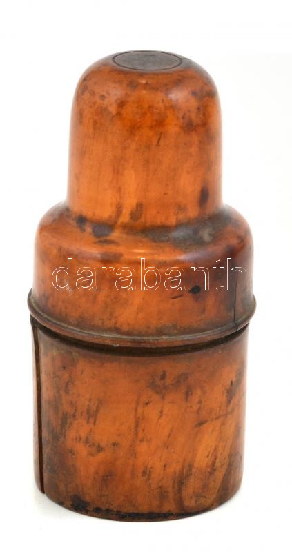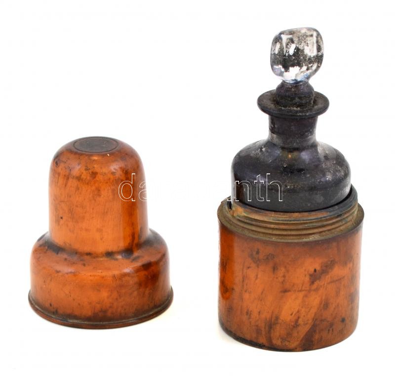 Leírás: Régi tintatartó üvegcse, minimális tartalommal, sérült fa tartóban, üveg: d: 8,5 cm, fa tartó: 9,5 cm