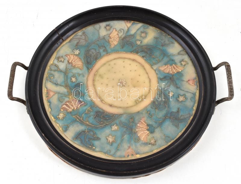 Leírás: Régi üvegezett, fa tálca, fém fogantyúval, benne kézzel festett selyem képpel, a fa kereten repedés található, d: 29,5 cm