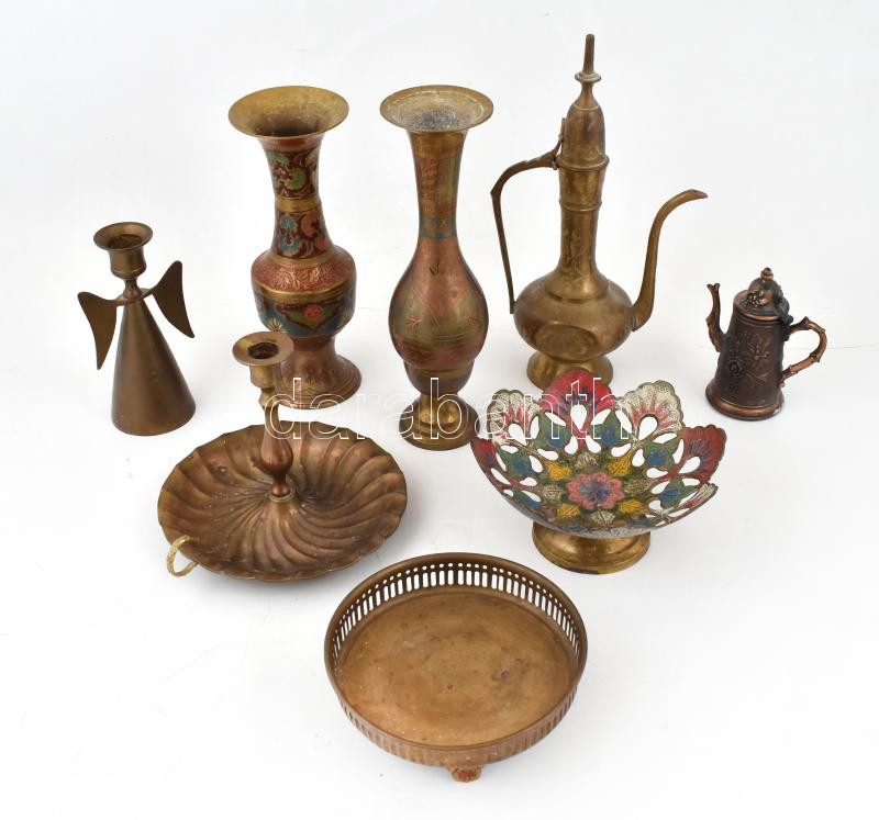 Leírás: Vegyes réz tárgy tétel, 8db (gyertyatartó, váza, tálka, stb.)