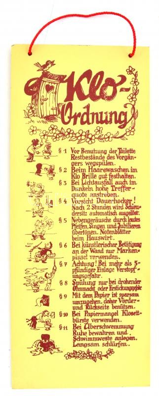 Vicces WC rendszabályok, németül, jó állapotban, 37,5x15 cm https://www.darabanth.com/hu/374-Gyorsarveres/374.0/Mutargy-papirregiseg-egyeb/Bolhapiac~12/Vicces-WC-rendszabalyok-nemetul-jo-allapotban-37-5x15-cm~II2191620