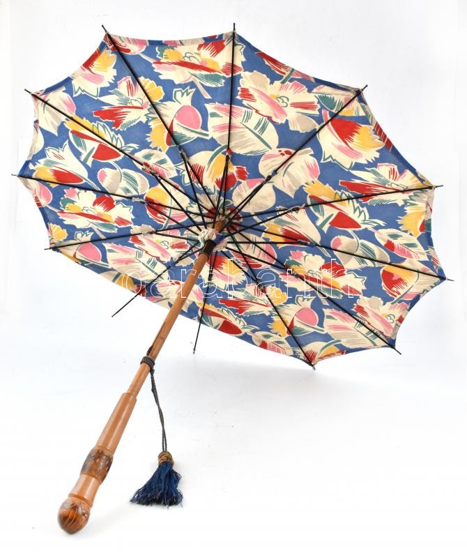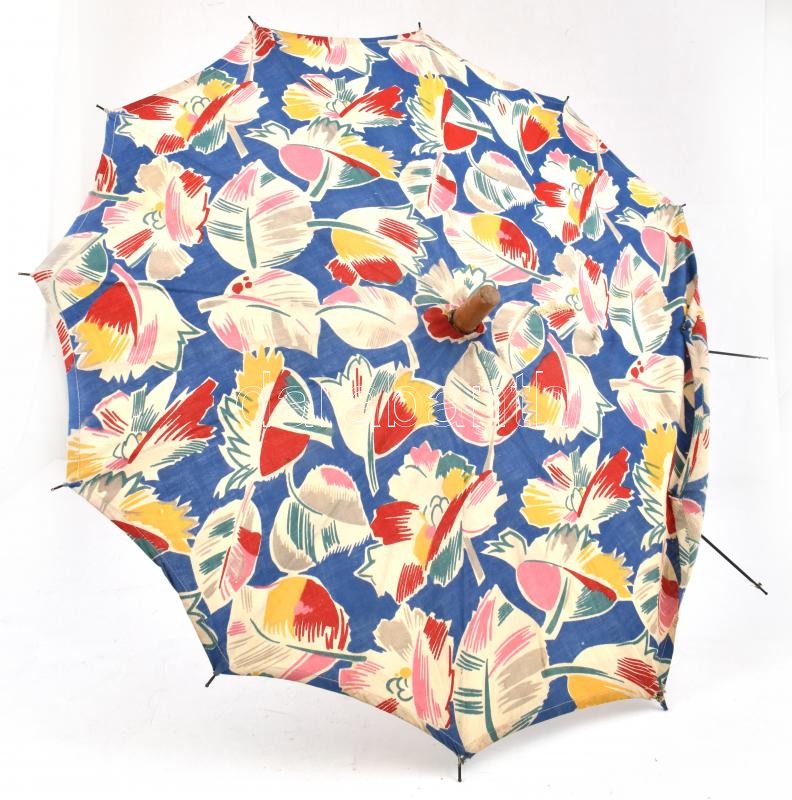 Leírás: cca 1920 Régi napernyő, fa nyéllel, a fa markolaton faragással, az ernyőn javítással, az egyik csúcsáról levált a szövet, d: 71 cm, h: 58 cm