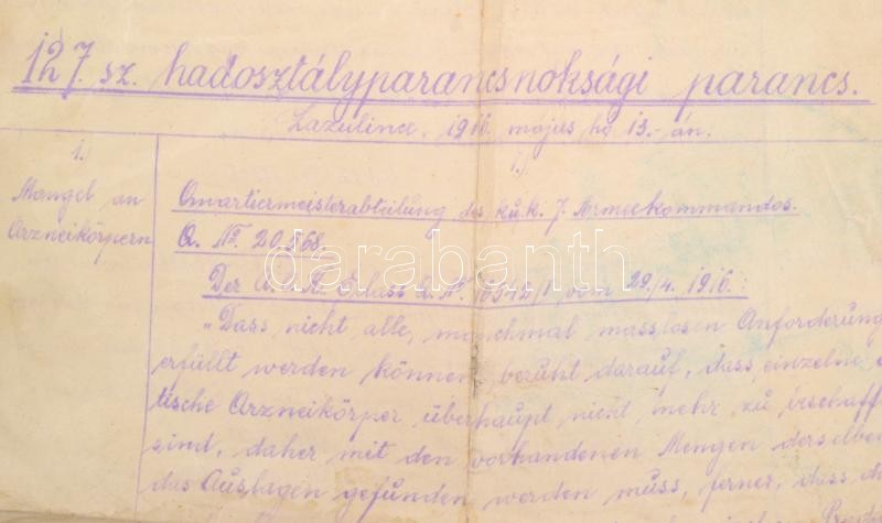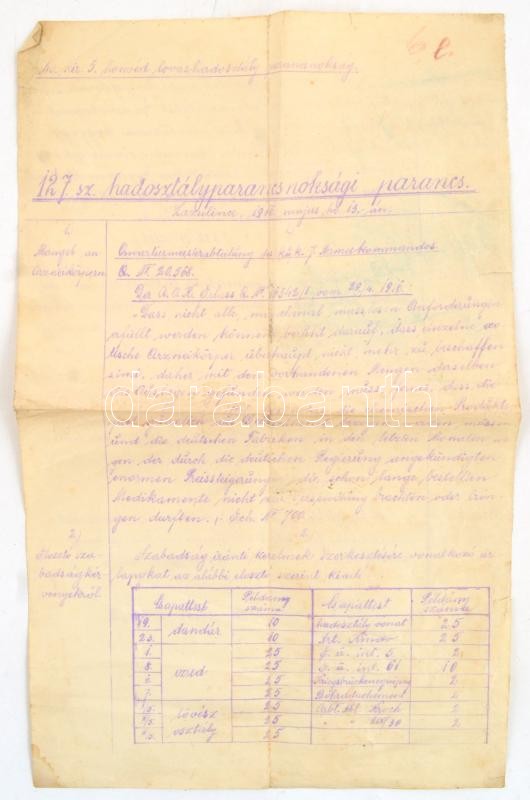1916 M. kir. 5. honvéd lovashadosztály 127. sz. hadosztályparancsnoksági parancs, kézzel írt, br. Apór altábornagy nevével a parancs alján. Szabadságolási témában, gyógyszerekkel és élelmiszerekkel való ellátásról, részben magyar, részben német nyelven, hajtásnyommal, kisebb szakadássokkal, két oldal