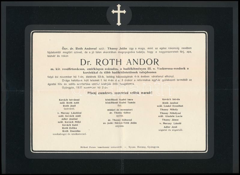 1937 Gyöngyös, Dr. Roth Andor (1884-1937) m. kir. rendőrtanácsos, emléklapos százados, a hadiékítményes III. o. Vaskorona-rendnek a kardokkal és több hadikitüntetés tulajdonosának gyászjelentése.