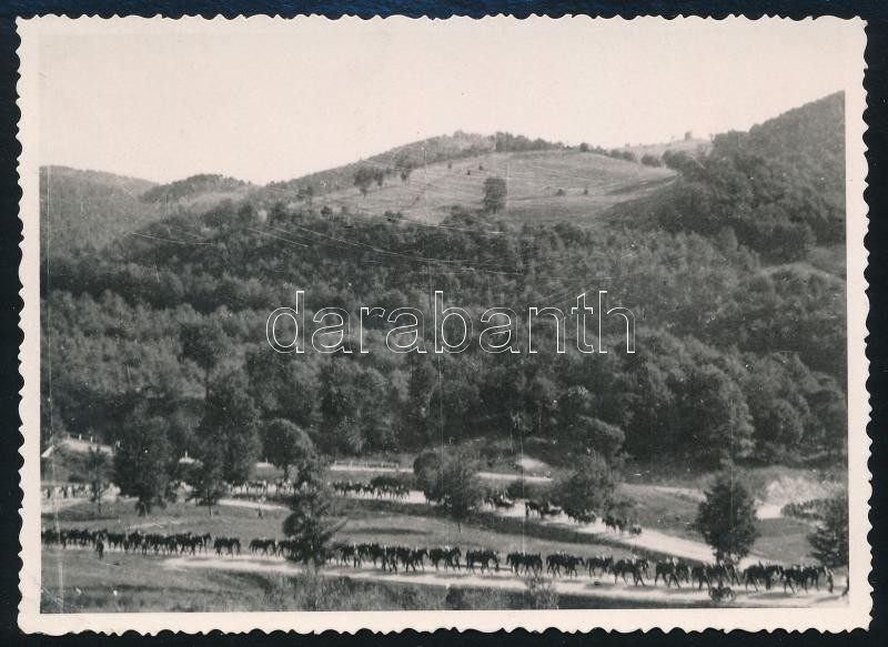 Leírás: 1940 Magyar katonai lovas egység a bevonuláskor a Király-hágónál, hátoldalon feliratozva, 8,5×11,5 cm