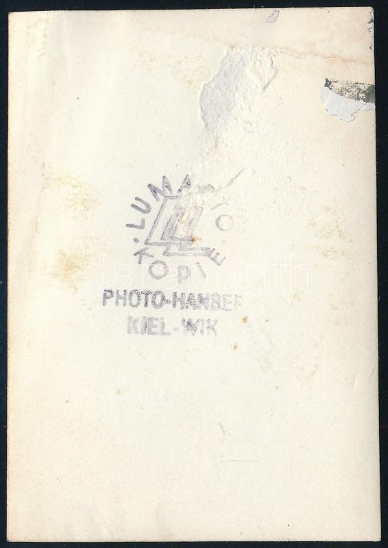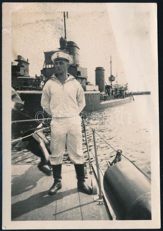cca 1935-1945 Német haditengerészeti (Marine) matróz növendék (kadét?) uniformban csatahajó előtt, sapkáján ...schule felirattal és birodalmi sassal, hátoldalán pecséttel jelzett (Photo-Hamber Kiel-Wik) vintage fotó, foltos, kissé sérült a bal szélén és hátoldalán. 9x6 cm / cca 1935-45 German navy (Marine) trainee (cadet?) in uniform, in front of a naval ship, with ...schule sign and eagle on his hat, vintage photo with stamp on the back (Photo-Hamber Kiel-Wik), spotty, with some wear on the left side and the back, 9x6 cm