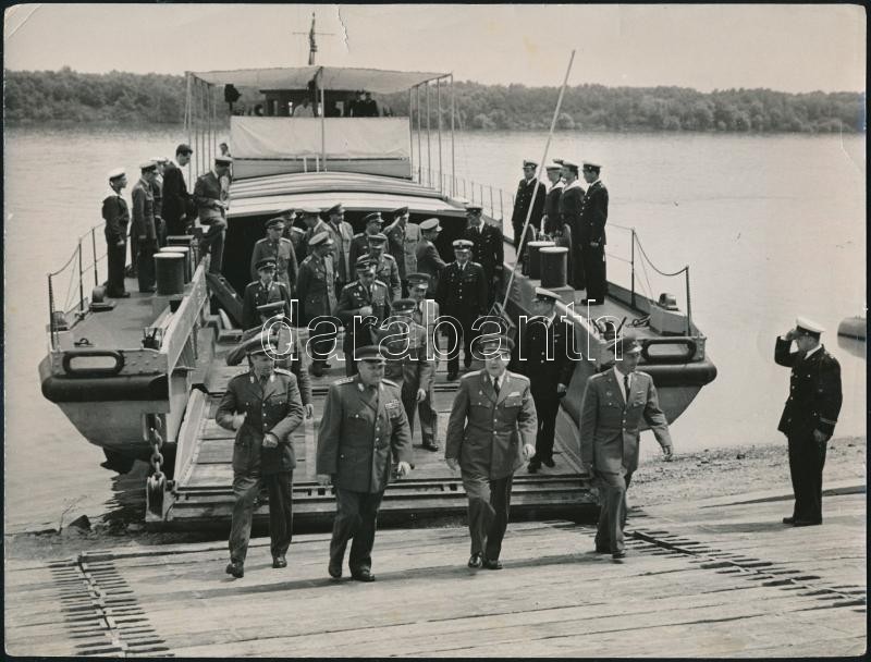 Révész Géza (1902-1977) honvédelmi miniszter és Oláh István (1926-1985) tábornok, későbbi honvédelmi miniszter fotója egy folyamátkeléskor, és egy katonai díszmenet fotója, az egyiken szakadással, törésnyomokkal a sarkokon, 18x24 cm