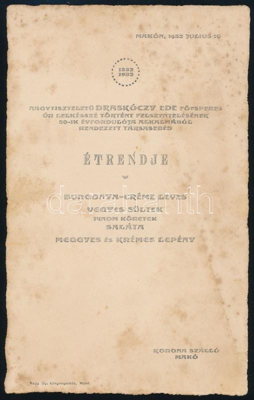 1932 Budai Szent Imre Collegium jótékonycélú kerti ünnepélyének meghÃvója, borÃtékkal, makói lakos részére. + Draskóczy Ede (1860-1935) evangélikus lelkész, fÅ‘esperes lelkésszé történt felszentelésének 50-ik évfordulója alkalmából rendezett társasebéd étrendje, Makó, Korona Szálló, foltos.