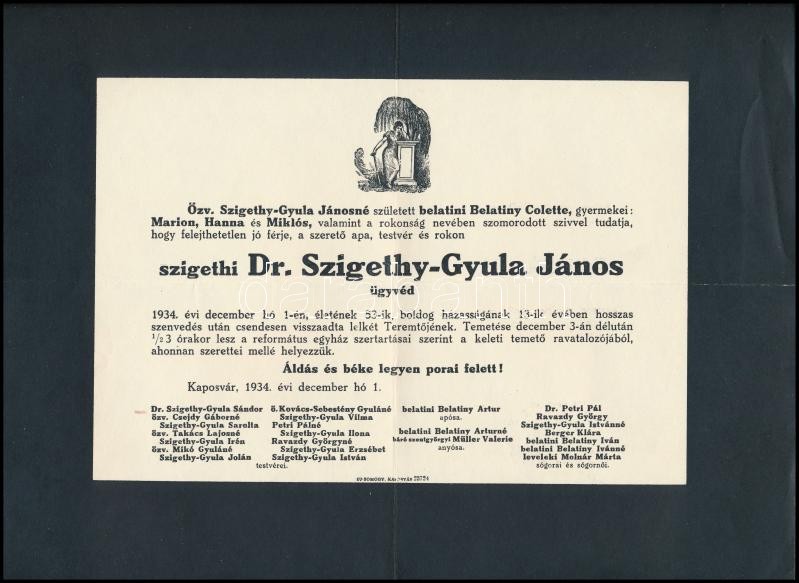 Leírás: 1934 Kaposvár, Szigethi Dr. Szigethy-Gyula János (1881-1934) ügyvéd gyászjelentése.