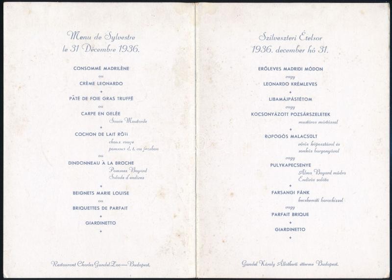 Leírás: 1936 Szilveszteri ételsor, Gundel Károly Állatkerti Étterme Budapest
