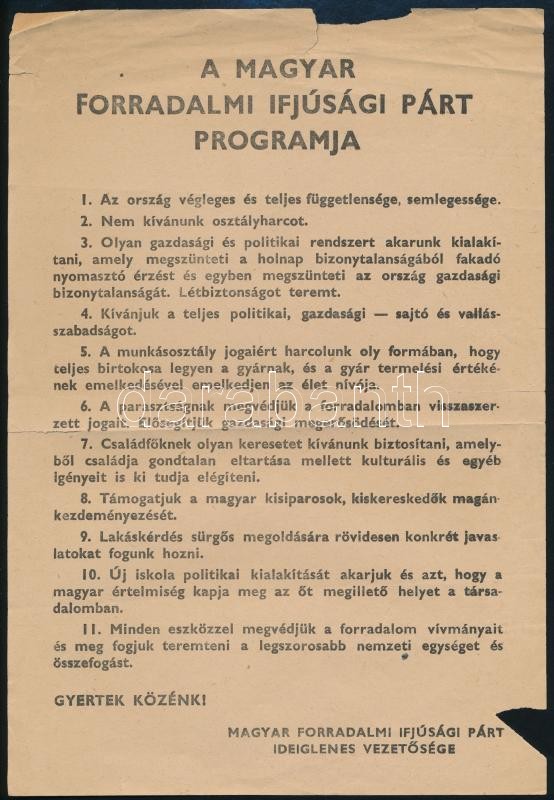 Leírás: 1956 Magyar Forradalmi Ifjúsági Párt programja, szórólap, szakadt, 24x16 cm