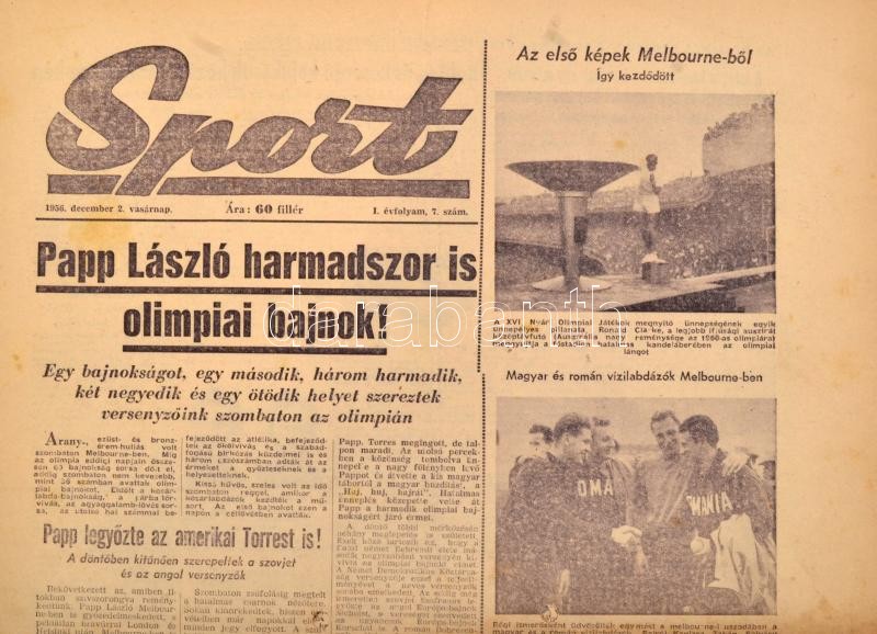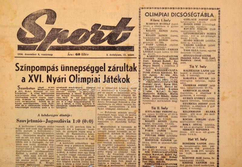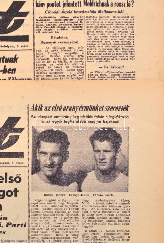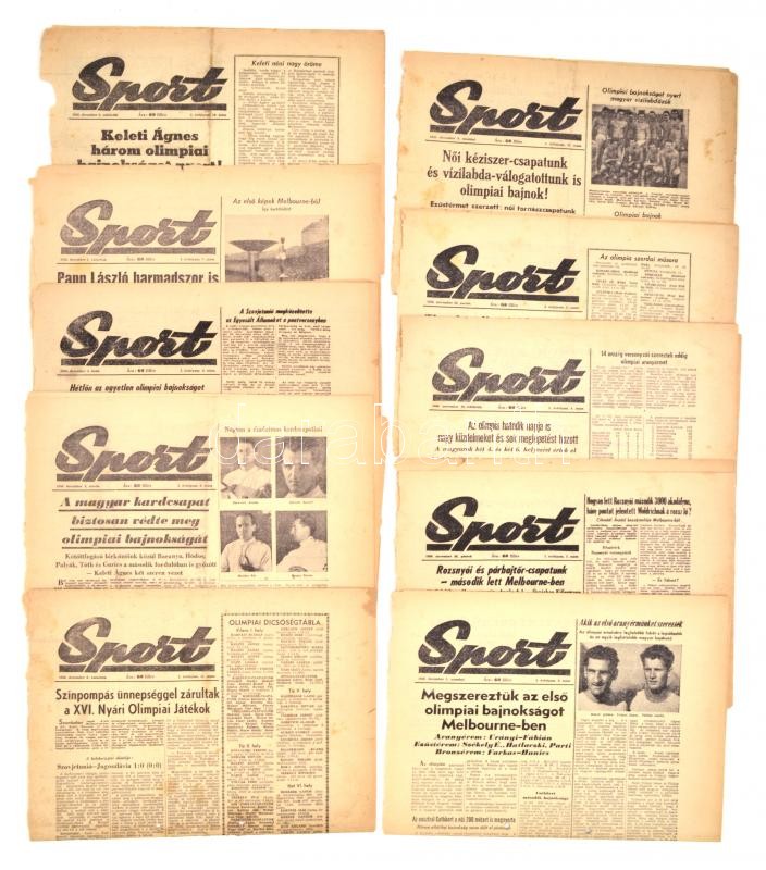 Leírás: 1956 Sport. I. évf. 3-13. sz., 1956. nov. 28-dec. 9., lyukasztás nyomokkal, felvágott lapokkal, közte "durván felvágott lapokkal", lapszéleken kis szakadásokkal. Melbourne-i Olimpiával foglalkozó számok.