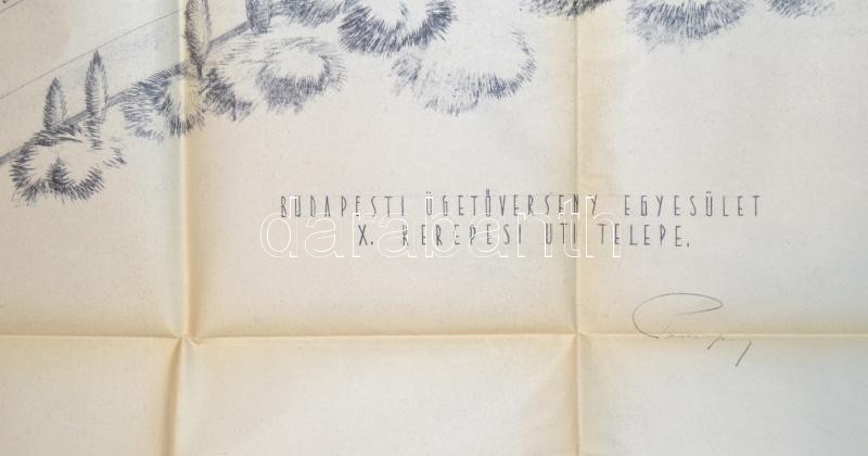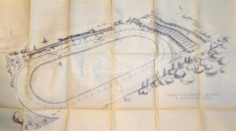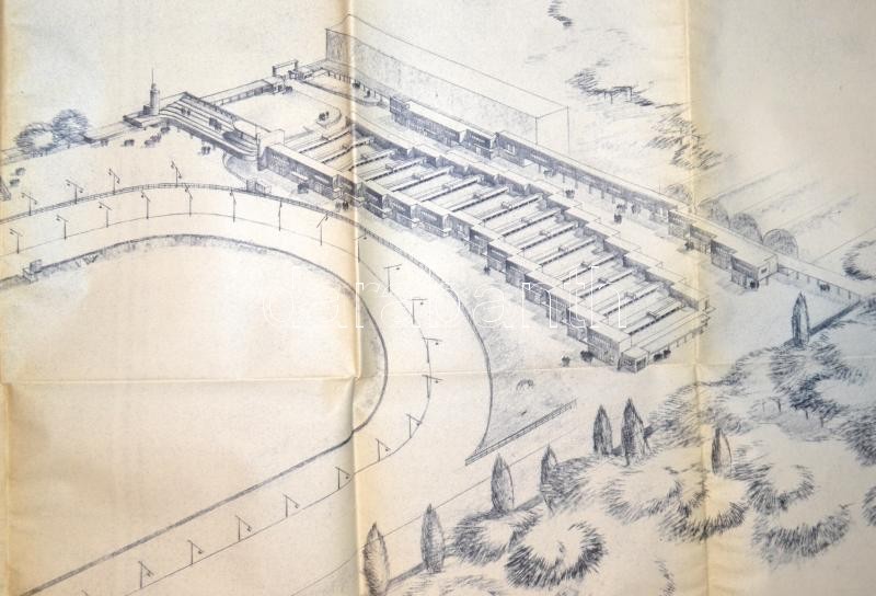 Az 1933-ban megnyitott kerepesi úti ügető (BÜE) távlati látványterve. Nagy méretű (a tervező: ifj. Paulheim Ferenc pecsétjével jelezve), hajtogatva, 120x65 cm