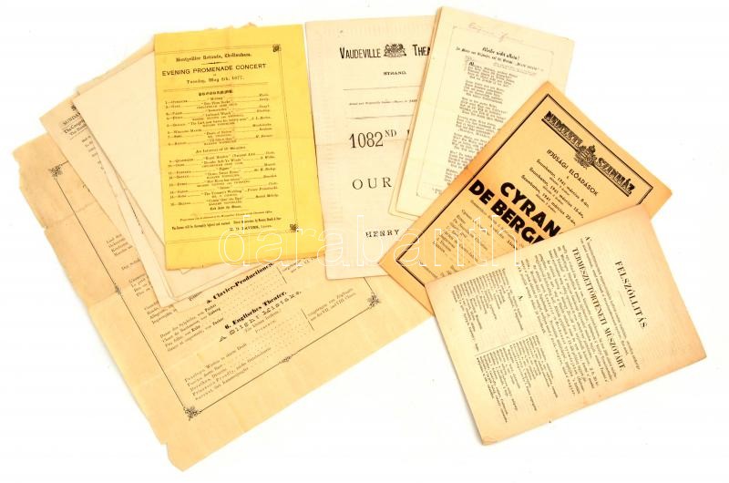 cca 1845-1941 Vegyes zenével és szÃnházzal kapcsolatos nyomtatvány tétel, össz. 14 db: Nemzeti SzÃnház, ifjúsági elÅ‘adások, 1941, Cyrano de Bergerac, 4 oldalas nyomtatvány. FelszóllÃtás Természettörténeti Müszótár elÅ‘fizetésére, 1845, Landerer és Heckenast nyomdájában, 4 oldalas nyomtatvány. + Német és angol nyelvű koncert és szÃnházi elÅ‘adások meghÃvója és prospektusa, többségében az 1870-es évekbÅ‘l. Részben sérült és hiányos,