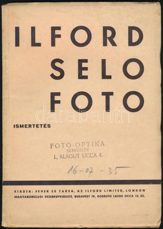 Leírás: cca 1930 Ilford Selo Foto. Ismertető prospektus. Bp., Fehér és Társa, 32 p. Kiadói papírkötés.