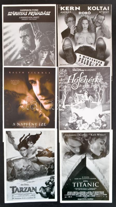 cca 1997-1999 6 db film, rajzfilm és animációs film ismertető nyomtatvány, közte: A napfény íze, A miniszter félrelép, Hófehérke és a hét törpe, Tarzan, Titanic, Szárnyas fejvadász