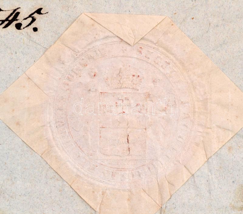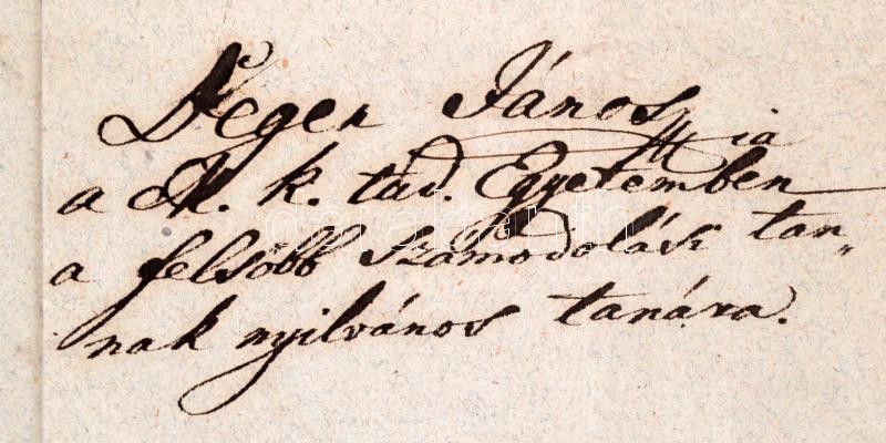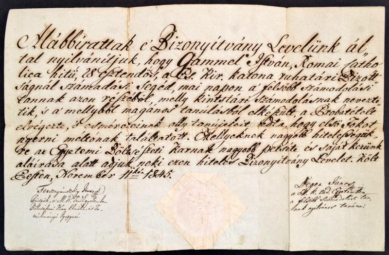 1845 Kincstári számadolástani (számvevői) vizsga bizonyítvány Tersnyánszky Imre püspök és Degen János tanár aláírásával. Kézzel írt, viaszpecséttel 41x24 cm
