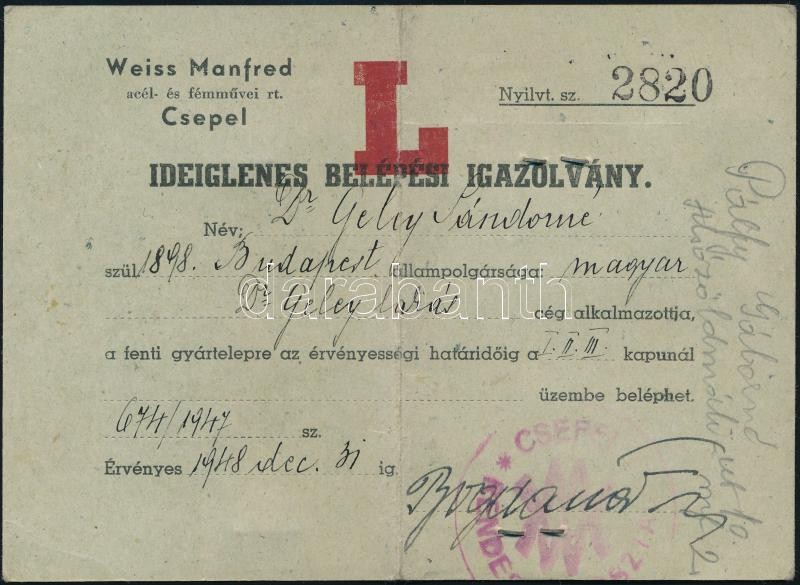 1947-48 Weiss Manfréd Acél. és Fémművei Rt. Csepel fényképes ideiglenes belépési igazolvány Geleji Sándorné Gerő Zsófia (1895-1966), Geleji Sándor (1898-1967), a csepeli Weiss Manfréd Acél- és Fémművek igazgatója (1945-49) felesége részére. Nevét tévesen "Geley"-ként írták le az okmányon.