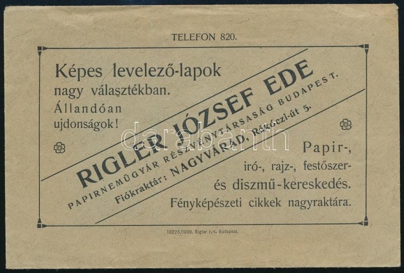 1909 Rigler József Ede Papírneműgyár Rt. reklámborítékja, 10x15 cm https://www.darabanth.com/hu/374-Gyorsarveres/374.0/Mutargy-papirregiseg-egyeb/Reklam~22/1909-Rigler-Jozsef-Ede-Papirnemugyar-Rt-reklamboritekja-10x15-cm~II2152010