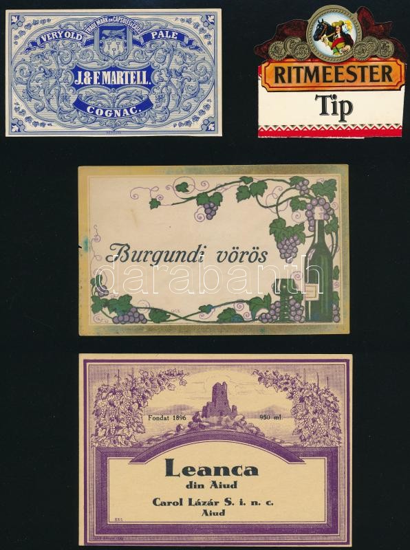 Leírás: 7 db italcímke (Ritmeester Tip, J&F Martell cognac, Burgundi vörös, Leanca, stb.)
