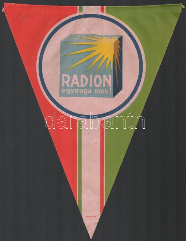Leírás: Régi Radion egymaga mos! illusztrált reklám zászló formában, papír, 29x22 cm