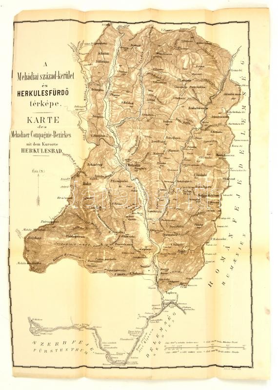 Leírás: 1872 A Mehádiai század-kerület és Herkulesfürdő térképe. Német és magyar nyelven. Rohn A., Pest. Hajtott, 60x41,5 cm