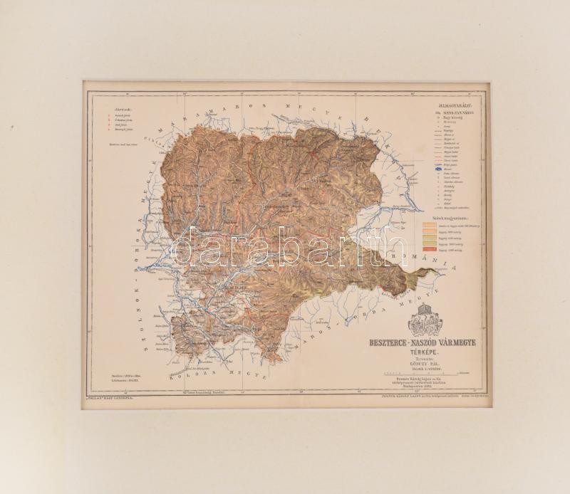 1893 Beszterce-Naszód vármegye térképe, terv. Gönczy Pál, Pallas Nagy Lexikona, 1:470000, Bp., Posner Károly Lajos és fia, paszpartuban, hajtásnyommal, két kisebb folttal, 22,5×28 cm / 1894, map of county Comitatul Bistrita-Năsăud, Komitat Bistritz-Nösen, now part of Romania, in passepartout, with two smaller spots