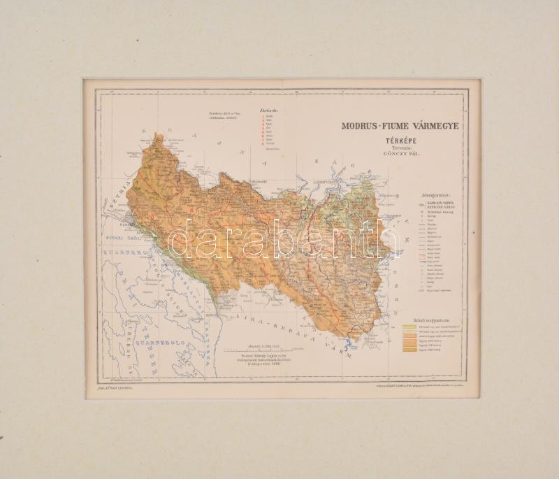 1896 Modrus-Fiume vármegye térképe, terv. Gönczy Pál, Pallas Nagy Lexikona, 1:580000, Bp., Posner Károly Lajos és fia, paszpartuban, hajtásnyommal, lap szélén kisebb szakadásokkal, 22,5×28 cm / 1896, map of Modruš-Rijeka county, Modruško-riječka županija, in passepartout, with small tears on the edge