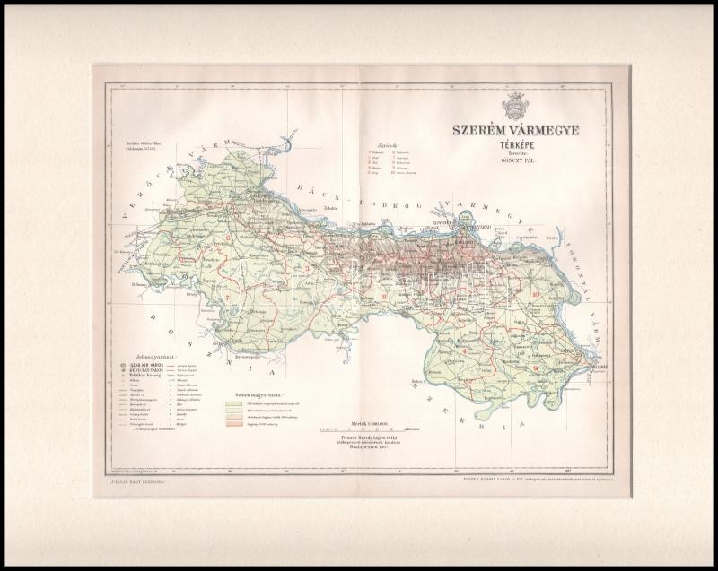 1897 Szerém vármegye térképe, terv. Gönczy Pál, Pallas Nagy Lexikona, 1:660000, Bp., Posner Károly Lajos és Fia, paszpartuban, hajtásnyommal, 23x28 cm / 1897, Map of Syrmia/Srijemska/Sremska županija/Komitat Syrmien, now part of Croatia and Serbia, in passepartout.