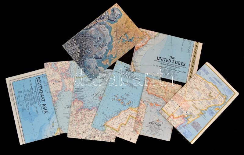 Leírás: 1966-1968 8 db National Geographic térkép (Southern California, Northwestern Africa, Western Canada, Eastern Soviet Union, The United States, stb.)