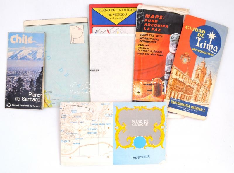 Leírás: Latin-amerikai városok térképei, 6 db (Santiago de Chile, Mexikóváros, La Paz, Lima, Buenos Aires, Caracas)