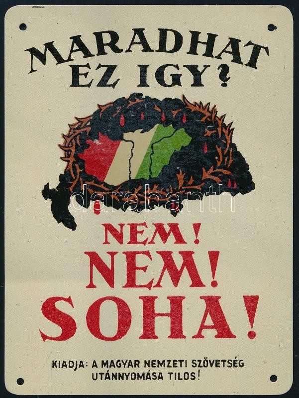 Leírás: cca 1930 "Maradhat ez így? Nem, nem, soha!" Magyar Nemzeti Szövetség irredenta fém tábla, kis deformációval, 8×6 cm