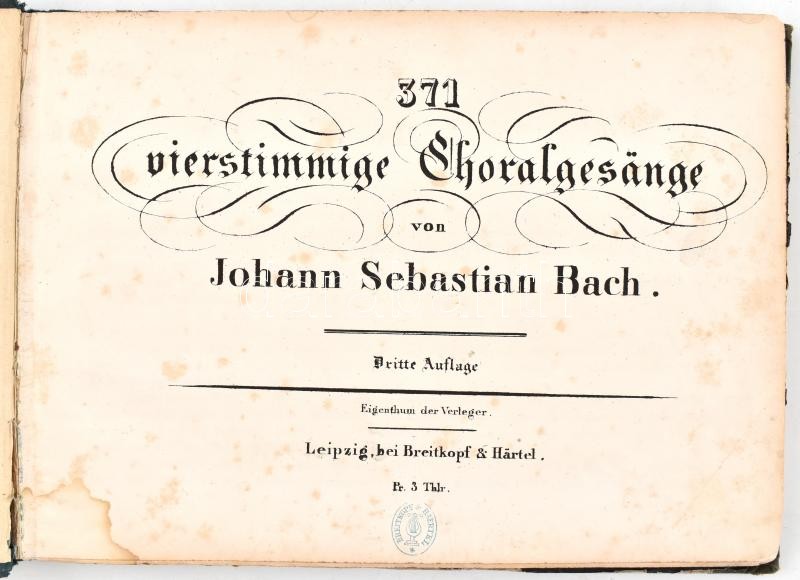 Johann Sebastian Bach: 371 vierstimmige Choralgesänge. Leipzig, 1831, Breitkopf&Härtel. Kották. Félvászon kötés, kissé sérült gerinccel és foltos lapokkal.